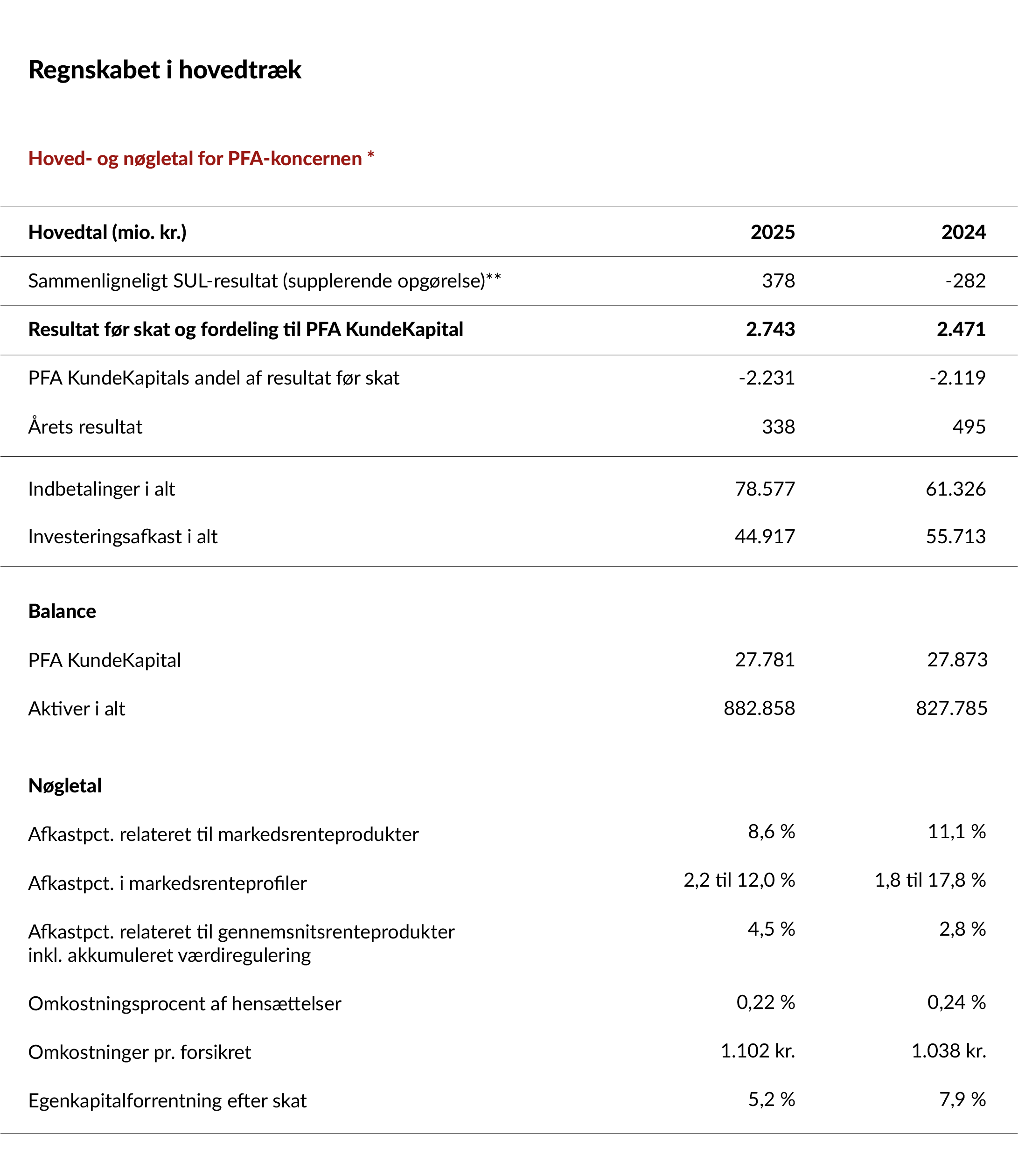Samlet set lander resultatet for al syge og ulykkesforretning i PFA, det sammenlignelige SUL resultat, for 2025 på 378 mio. kr. mod -282 mio. kr. i 2024. Det understreger, at området nu er i balance herunder også driftsresultatet, præmieindbetalinger minus skadesudgifter, på 58 mio. kr. Resultatet er blandt andet positivt påvirket af investeringsafkast og negativt påvirket af en engangshensættelse til øget risikomargen.